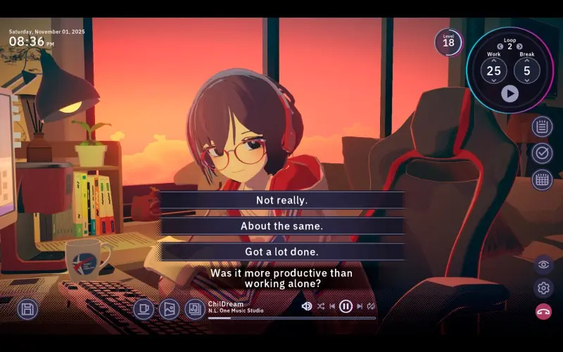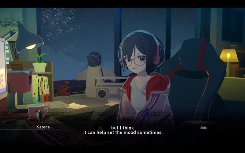 Werk rustig aan je bureau naast Satone, een creatief meisje dat verhalen schrijft en haar wereld vult met verbeelding. Pas de omgeving aan met muziek en beelden die haar gevoelens weerspiegelen, zodat jullie je allebei beter kunnen concentreren. Naarmate jullie meer tijd samen doorbrengen, kan je band met Satone hechter worden.