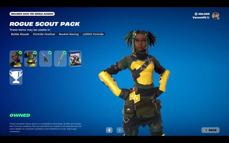 Het Rogue Scout Pack is een DLC-uitbreidingspakket voor Fortnite, ontwikkeld door Epic Games. Bevat cosmetische items en de PvE-campagne “Save the World”.