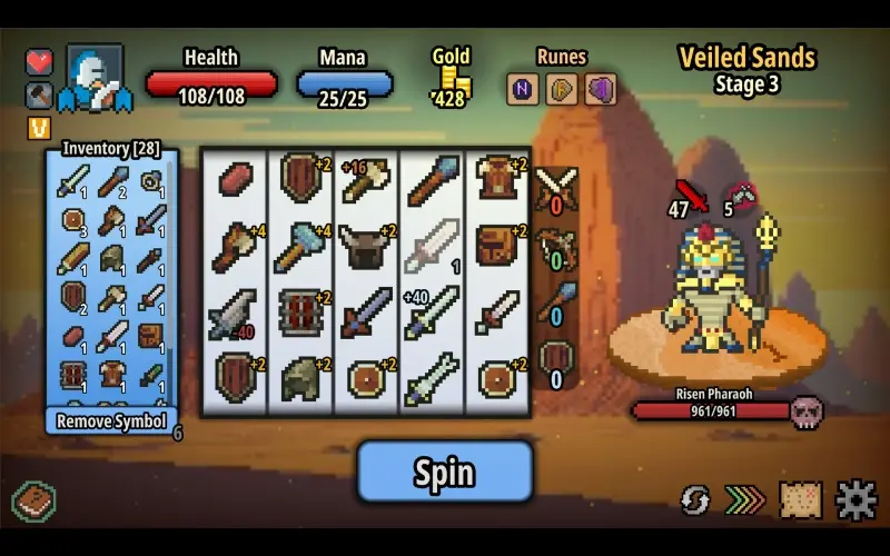 Spin Hero combineert roguelike-avontuur met deckbuilding-strategie. Verken procedureel gegenereerde levels waar elke spin je lot bepaalt. Verzamel symbolen, trotseer vijanden en pas je tactiek aan om bazen te verslaan en nieuwe synergieën te ontdekken.