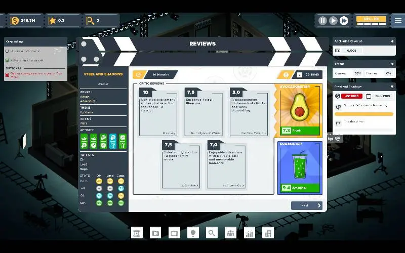 • Creëer je films door genres te kiezen, acteurs in te huren en budgetten te overzien om kritieken in harmonie te brengen met commerciële prestaties.