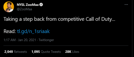 Eerder dit jaar meldde NBC News dat professioneel gamer Tommy “ZooMaa” Paparatto de handdoek in de ring gooide en op 25-jarige leeftijd stopte met competitief esports. Door herhaaldelijke hand verrekkingen moest ZooMaa een paar jaar geleden een operatie ondergaan. Helaas kwam de blessure terug en hij zei dat hij daardoor niet meer op het hoogste niveau kan spelen. Hij zal zich in de nabije toekomst niet bij de andere Call of Duty-winnaars voegen vanwege duim- en polsblessures.